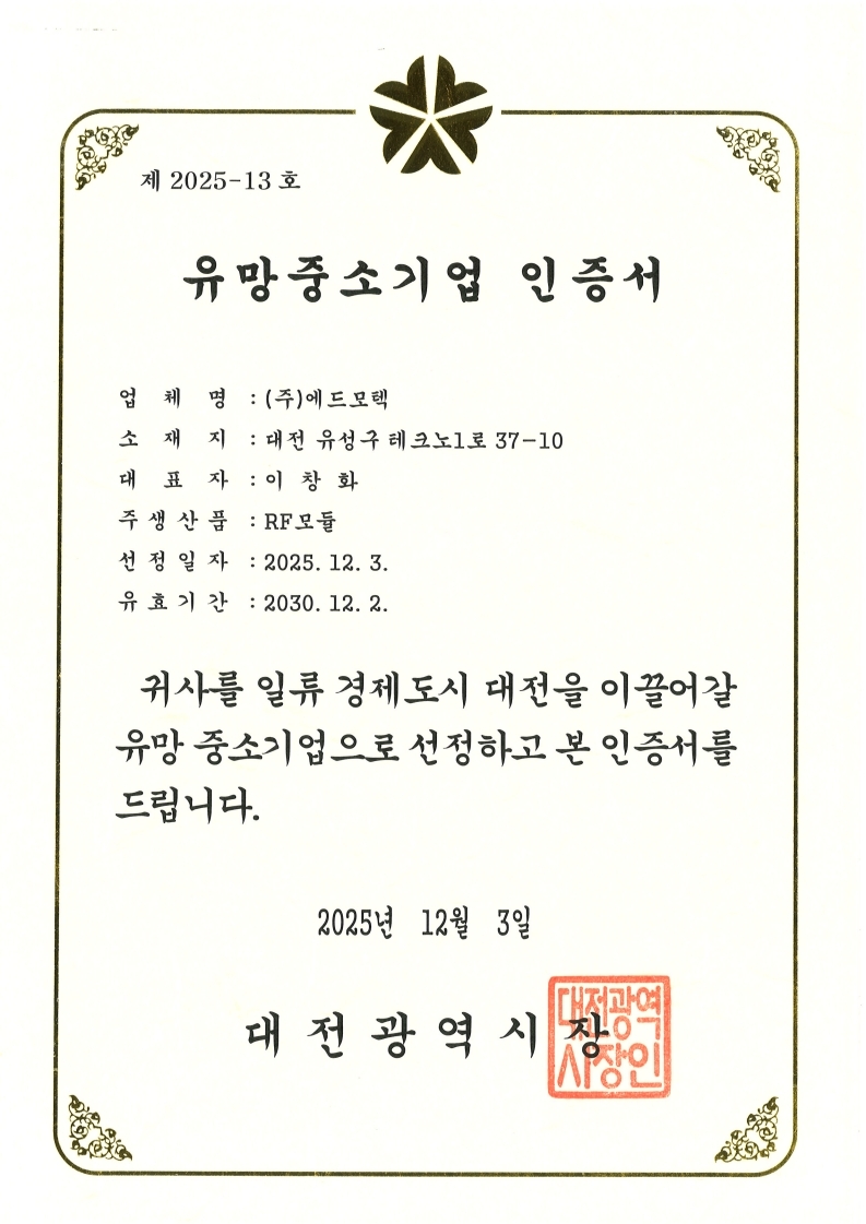 유망중소기업인증서_제2025-13호 페이지 정보 작성자 관리자 작성일 24-06-13 14:03 조회 1,007회 댓글 0건 본문 . 이전글소재부품장비전문기업확인서_제34263호 다음글첨단기술기업 지정서 목록 댓글목록 0 댓글목록 등록된 댓글이 없습니다.