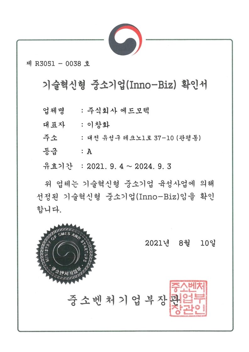 기술혁신형 중소기업(Inno-Biz) 확인서_제R3051-0038호 페이지 정보 작성자 관리자 작성일 24-06-13 14:21 조회 1,267회 댓글 0건 본문 . 이전글패밀리기업인증서_한국핵융합에너지연구원 다음글소재부품장비전문기업확인서_제34263호 목록 댓글목록 0 댓글목록 등록된 댓글이 없습니다.