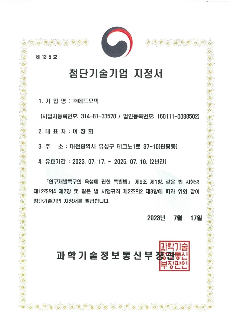 첨단기술기업 지정서 페이지 정보 작성자 관리자 작성일 24-06-13 13:58 조회 1,077회 댓글 0건 본문 . 이전글유망중소기업인증서_제2025-13호 다음글벤처기업확인서_20240513020008호 목록 댓글목록 0 댓글목록 등록된 댓글이 없습니다.